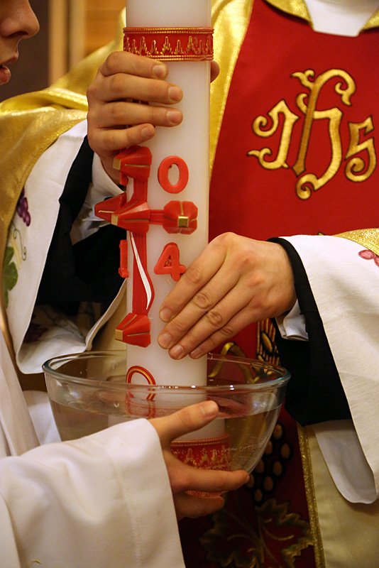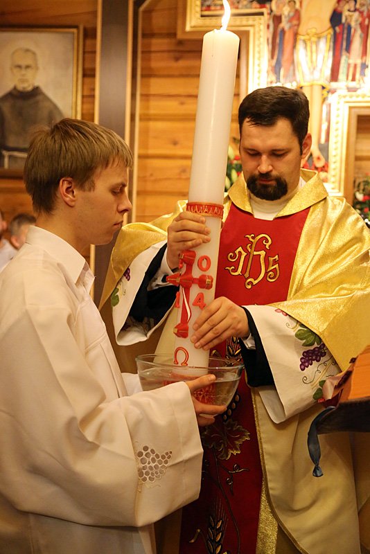 касцёлам святар благаслаўляе агонь, потым запальвае пасхал (вялiкую