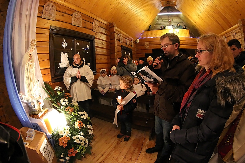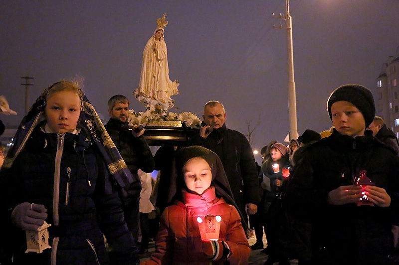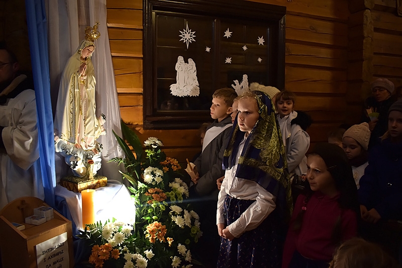 Перад тым, як размясціць фігуру Маці Божай на спецыяльна прыгатаваным і ўпрыгожаным для Яе месцы, адбылося ўрачыстае прывітанне фігуры і працэсія, у якой удзельнічалі ўсе прадстаўнікі нашай эўхарыстычнай супольнасці: дзеці, моладзь і дарослыя. Тут можна было ўбачыць таксама "фацімскіх пастушкоў", якія разам з кс. Пробашчам Алегам першымі прывіталі Божую Матулю.
