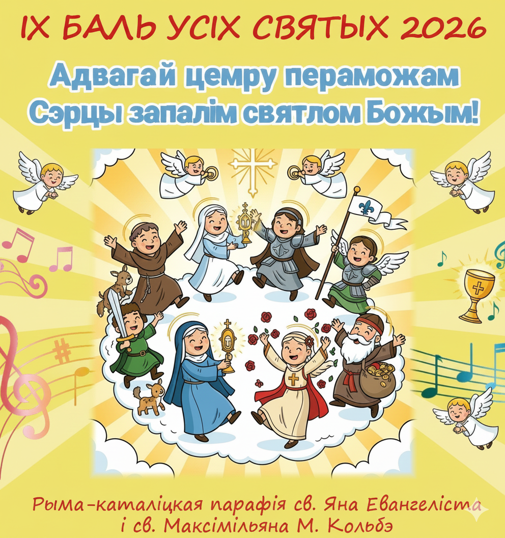 У нядзелю 18 студзеня адбудзецца дзевят ы парафіяльны Баль Усіх Святых . Сёлетняя тэма Балю — «Адвага супраць цемры» . Месца правядзення — касцёл Маці Божай Будслаўскай (вул. Прытыцкага, 107а). Пачатак — а 15:00, рэгістрацыя ўдзельнікаў пачнецца а 14: 15 (дольны касцёл).