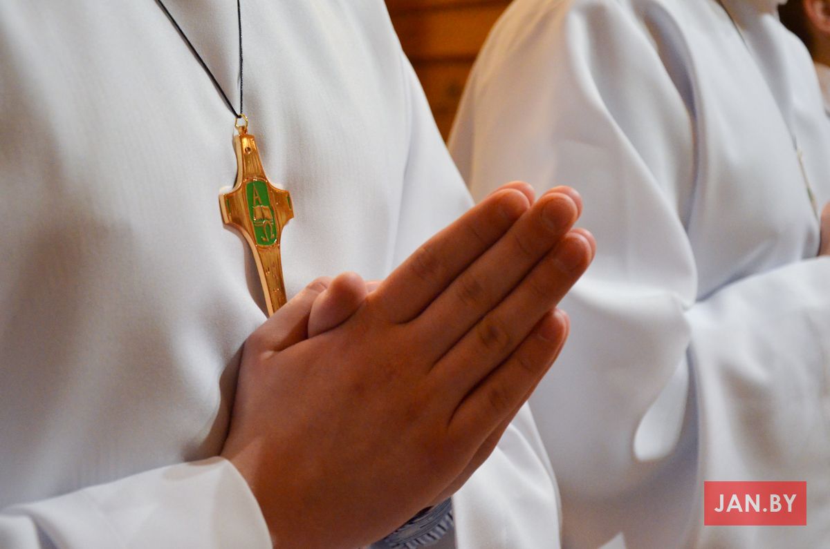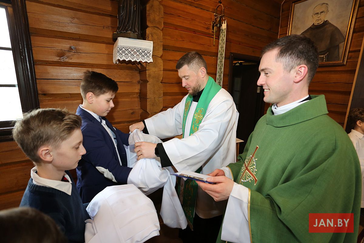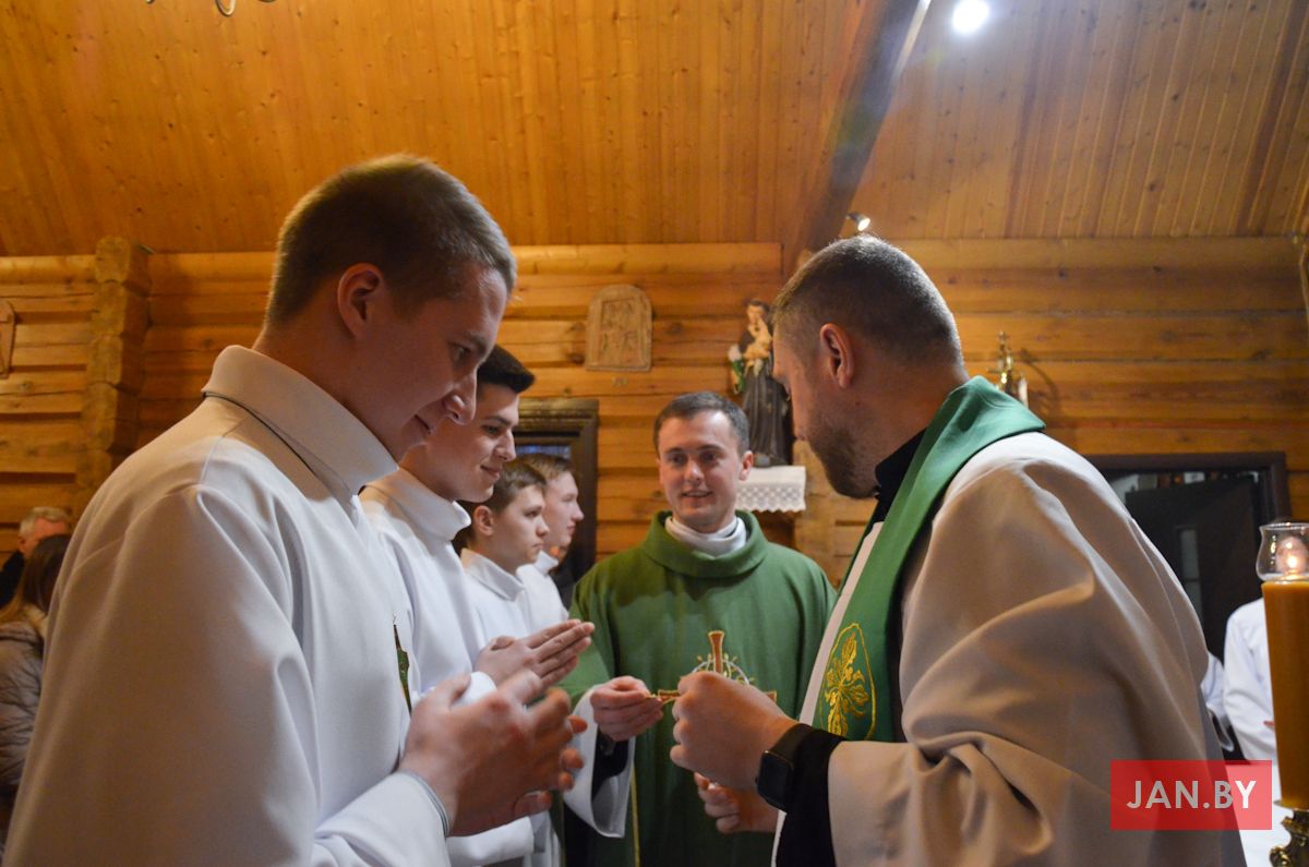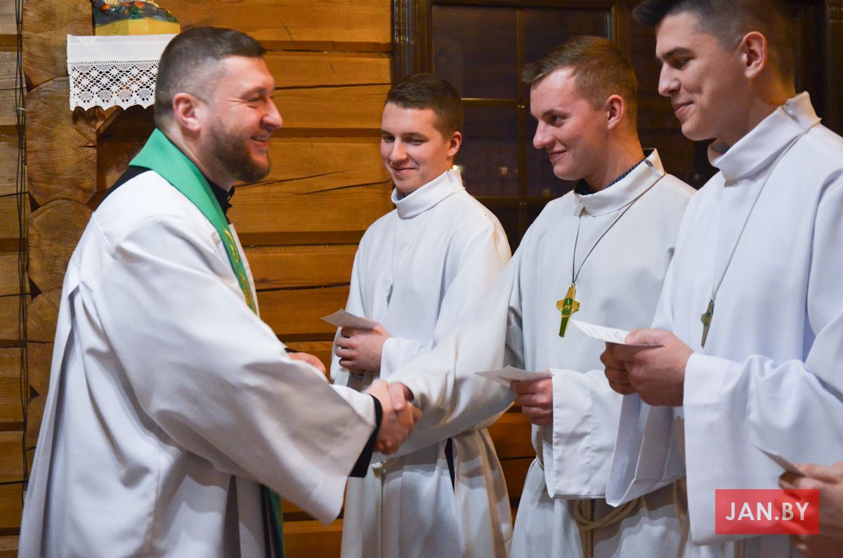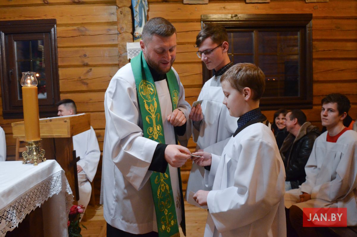 Сёння мелі гонар упершыню надзець стужкі кандыдатаў у міністранты 10 хлопцаў. Белы колер стужак будзе нагадваць ім пра чысціню душы, якая неабходна для жыцця вечнага. Гэтыя хлопцы толькі распачынаюць шлях трывання літаральна побач з Богам.
