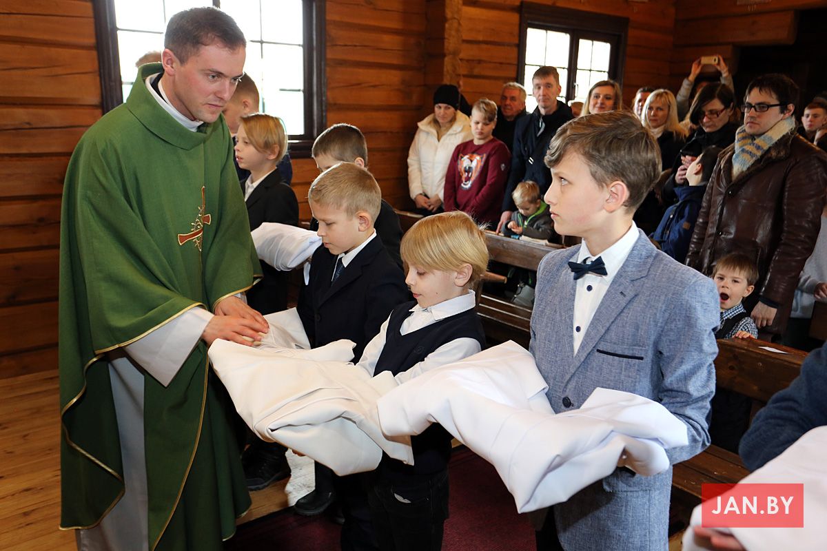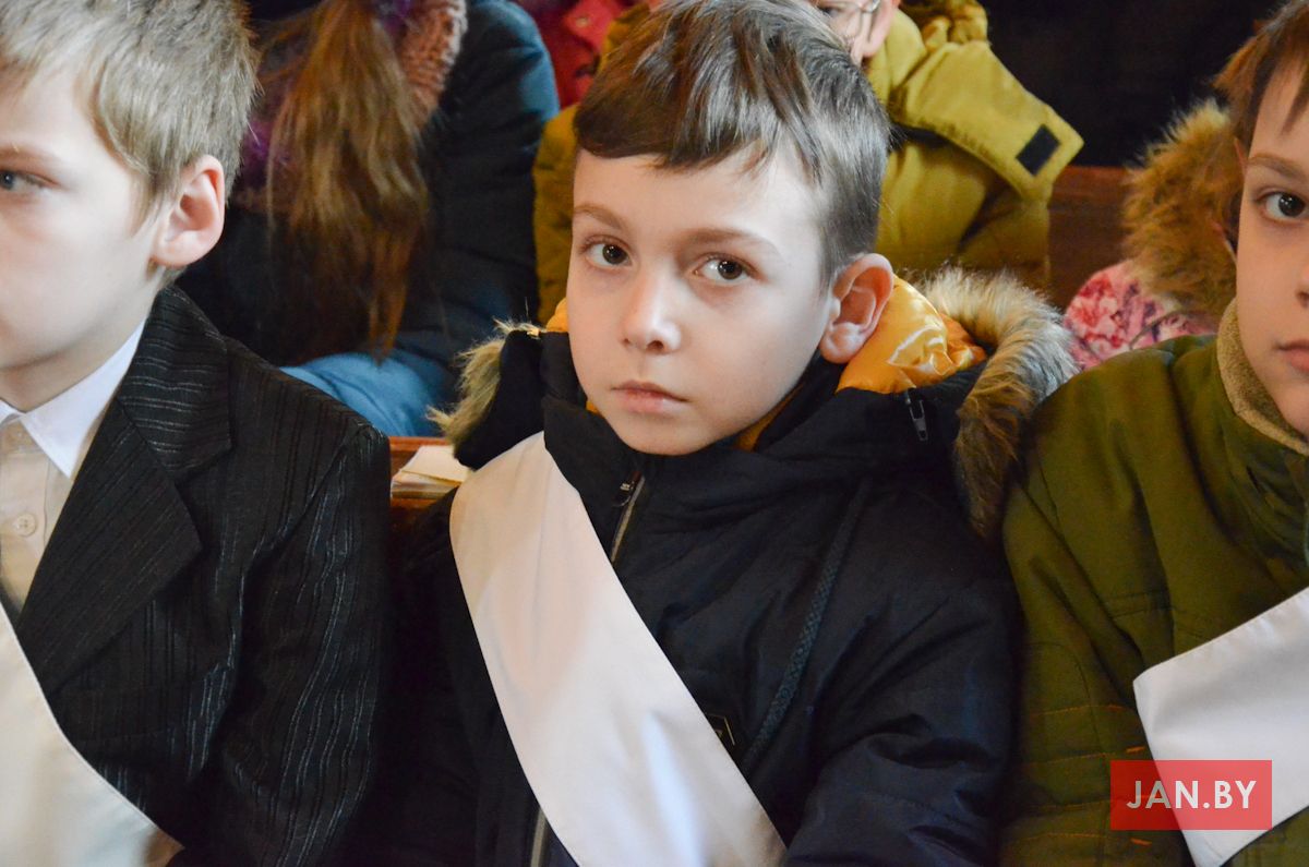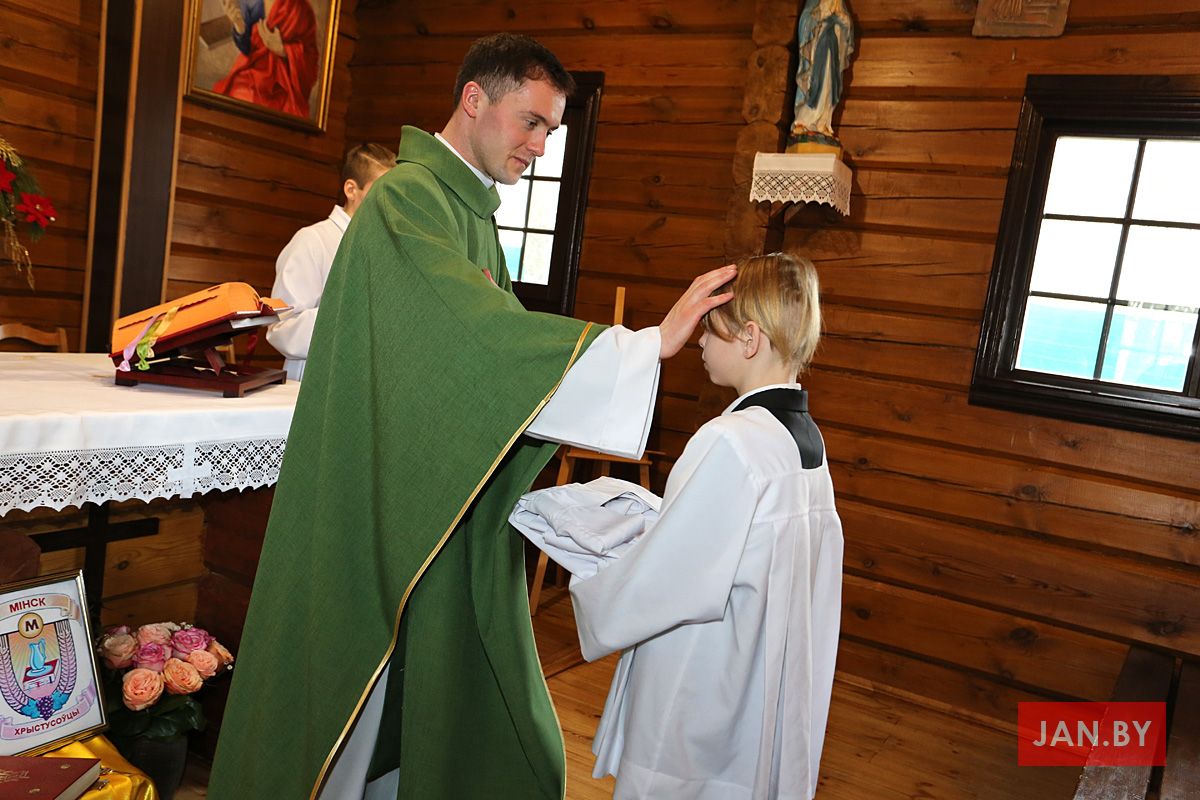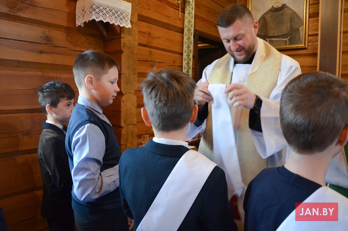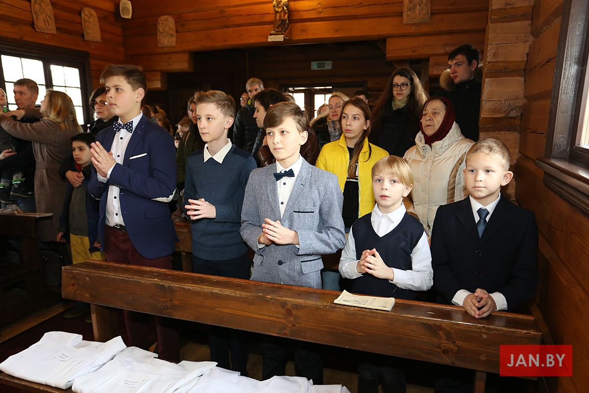 Сёння мелі гонар упершыню надзець стужкі кандыдатаў у міністранты 10 хлопцаў. Белы колер стужак будзе нагадваць ім пра чысціню душы, якая неабходна для жыцця вечнага. Гэтыя хлопцы толькі распачынаюць шлях трывання літаральна побач з Богам.