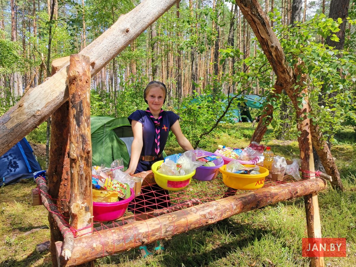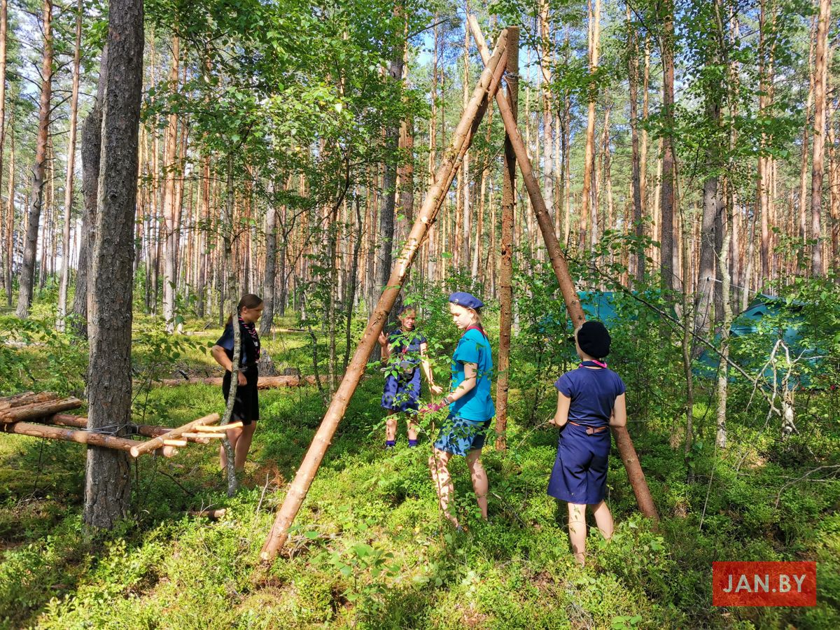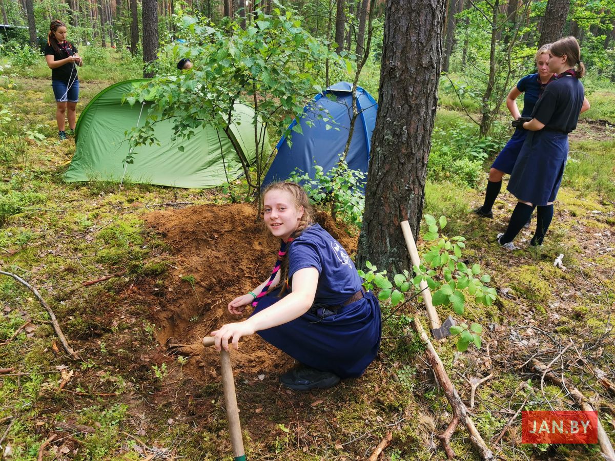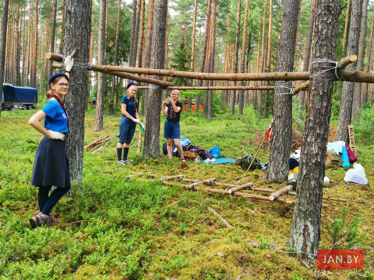 Сапраўдная прыгода распачалася, калі бацькі, якія дапамаглі прывезці сваіх дзяцей і іх рэчы, паехалі дамоў, а скаўткі пачалі, як мурашкі, звыклы для іх рытм летніка. Я не паспявала за імі сачыць, бо ўсіх нас разам было 47 асобаў. Адны ставяць намёт, другія нясуць бэльку для будавання платформы, трэція вяжуць сходы, іншыя рыхтуюць месца для вогнішча.