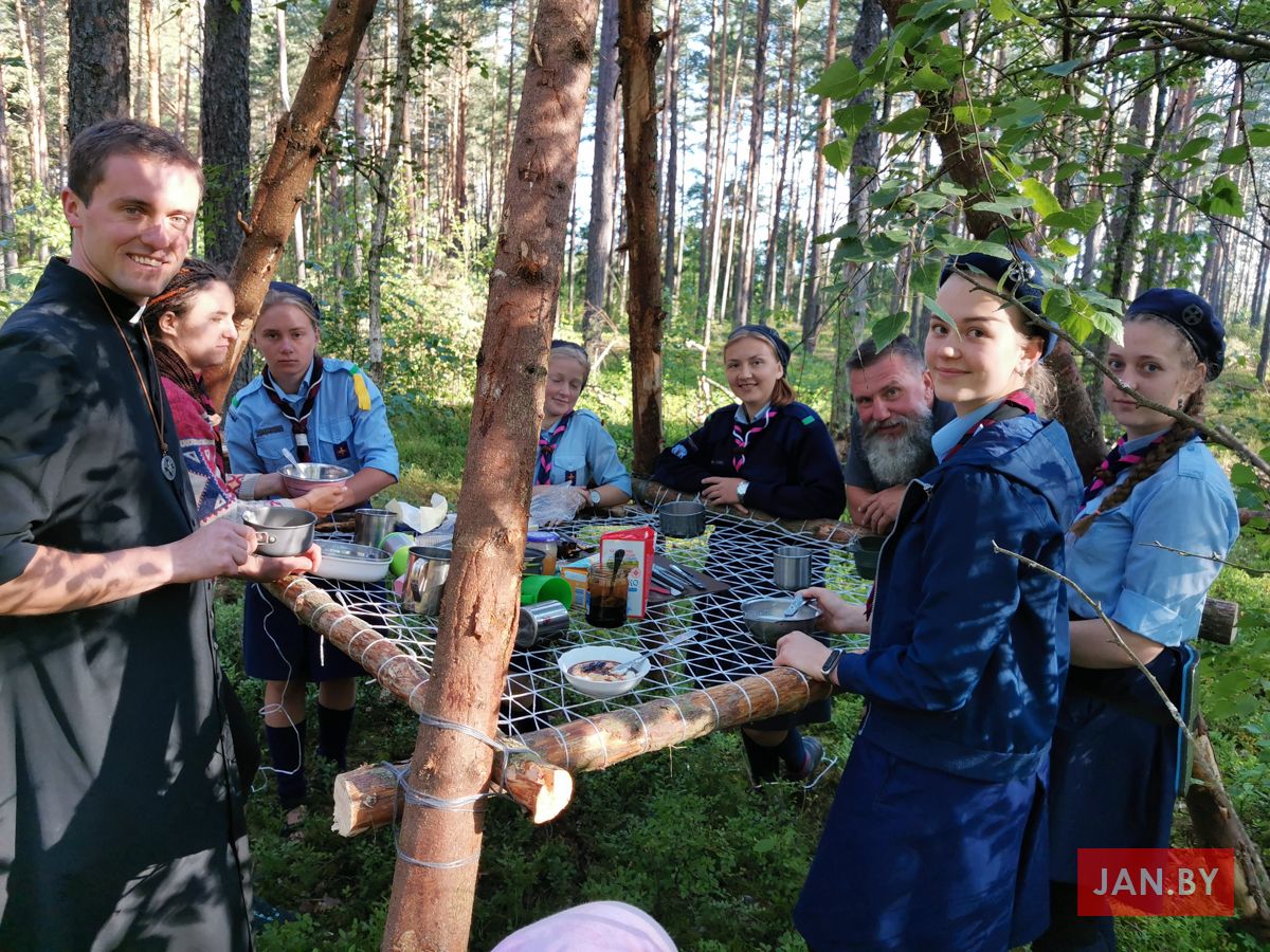 Чацвёрты дзень распачаўся з шыхтавання і Святой Імшы. Падчас снедання я даведалася, што мяне запрасілі на абед у кап’ё “Пчолка” з Івянецкага звязу св. Кляры. Ёсць такая прыгожая традыцыя, што кожны дзень на абед коп’і запрашаюць да сябе кагосьці з крааля. Вельмі цікава назіраць, як перад абедам прыходзіць кап’явая сама альбо з усім кап’ём і запрашаюць звязовую, шэфа альбо святара на абед. Кожнае кап’ё хоча вылучыцца і быць арыгінальным ва ўсім, пачынаючы ад запрашэння. Мяне запрасілі так: “выкралі” майго асістэнта і пакінулі ліст з умовамі, куды і з чым я павінна прыйсці. Такой прыгоды са мной не было нават у дзяцінстве! Калі я прыйшла ў вызначанае месца, то мяне ўжо там чакалі неверагодныя дзяўчаткі, сапраўдныя пчолкі, якія прыгатавалі абед са смажаных кабачкоў, дранікаў у выглядзе сардэчак, кампоту з чарніцаў і, канешне, салодзенькага да кампоціку.