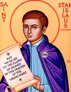Святы Станіслаў Костка нарадзіўся ў Расткове на Мазоўшы напрыканцы снежня 1550 года. З дзяцінства адзначаўся набажэнствам да Найсвяцейшага Сакра-мэнту і да Маці Божай. Разам з братам быў высланы да іезуіцкіх школаў у Ведню. Меў аб’яўленне Маці Божай, якая параіла яму ўступіць да закону іезуітаў. Па той прычыне, што не мог разлічваць на дазвол бацькоў, пераапрануты ўцёк з Ведня, пе-ша дабраўся да Дылінгі ў Баварыю і з’явіўся ў святога Пятра Канізыя. Той святы вы-слаў яго да Рыму, дзе святы Францішак Боргаш прыняў Станіслава да навіцыяту. У навіцыяце Станіслаў будаваў усё асяродзе ўзорным жыццём. Запалены полымем Бо-жай любові выпрасіў сабе смерць у свята Унебаўзяцця Найсвяцейшай Панны Марыі ў 1568 годзе. Яго рэліквіі знаходзяцца ў Рыме ў касцёле святога Андрэя на Квіры-нале. Святы Станіслаў з’яўляецца патронам Польшы.