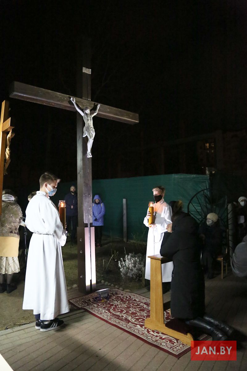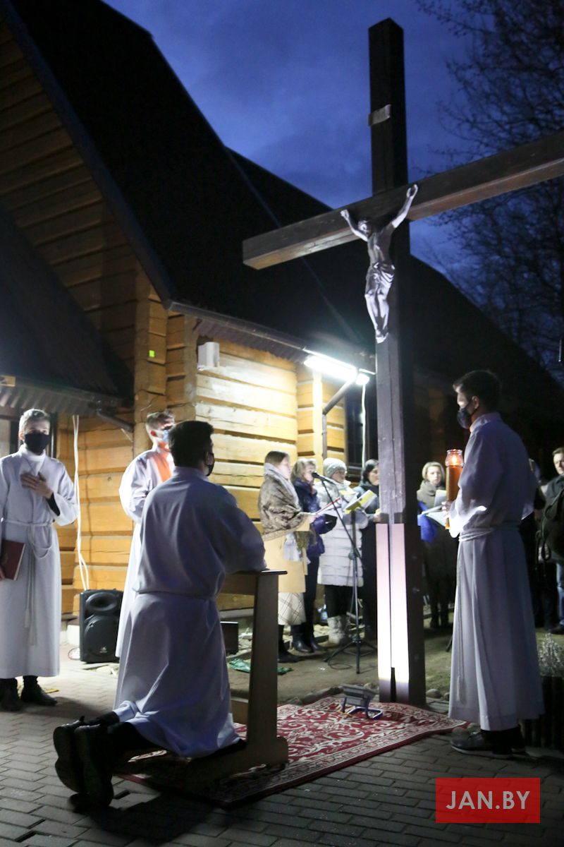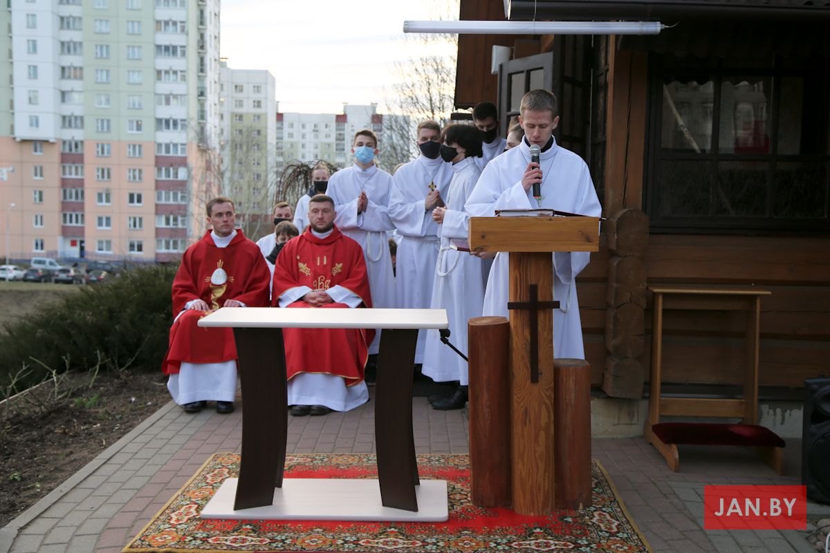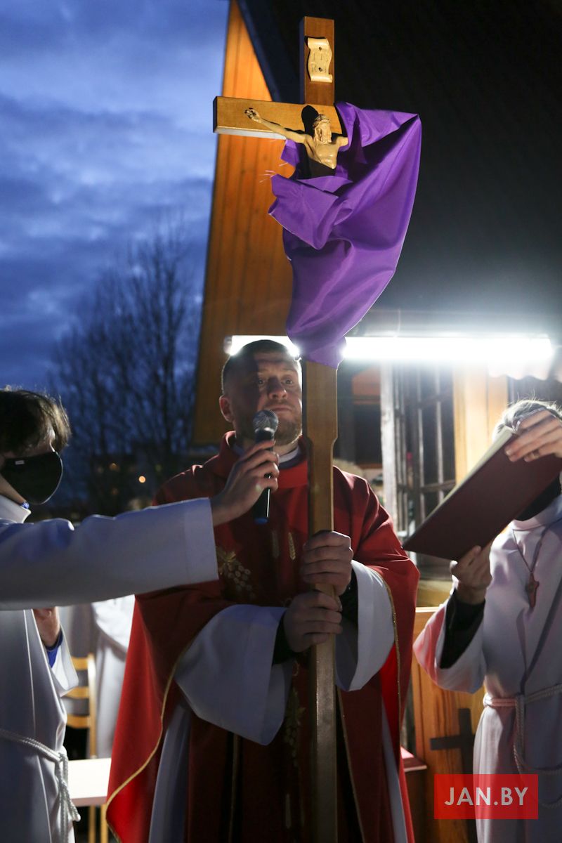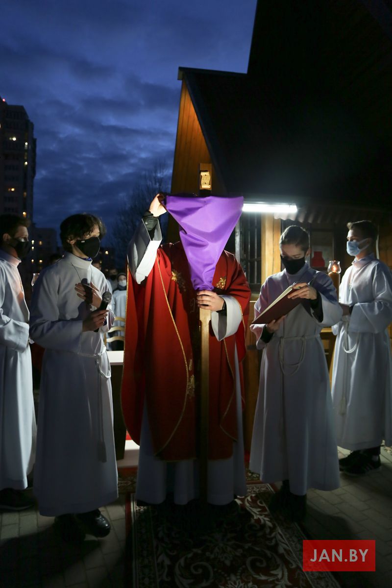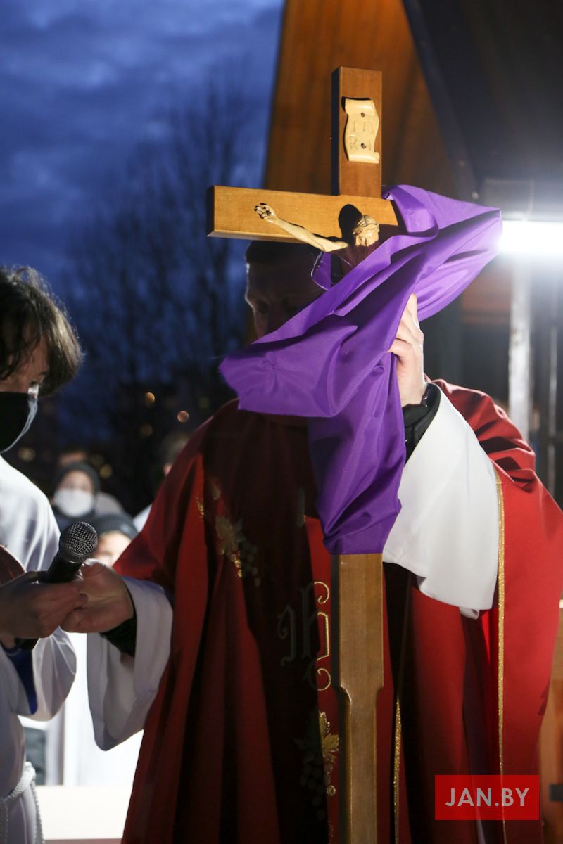 Цэлебрацыю літургіі Мукі Пана ў нашай капліцы ўначаліў пробашч парафіі кс. Алег Шпець SChr. Спачатку святар паклаўся перад алтаром крыжам і пэўны час маліўся ў маўчанні. Затым, падобна як у Пальмовую нядзелю, чыталася па ралях Евангелле з апісаннем Мукі Хрыста.