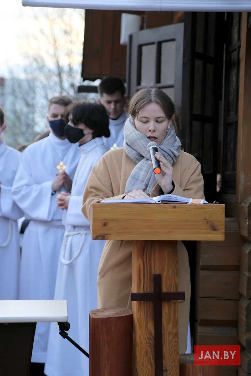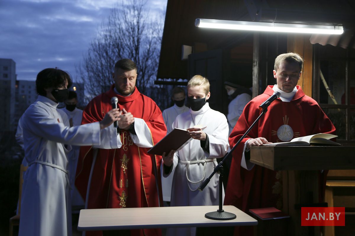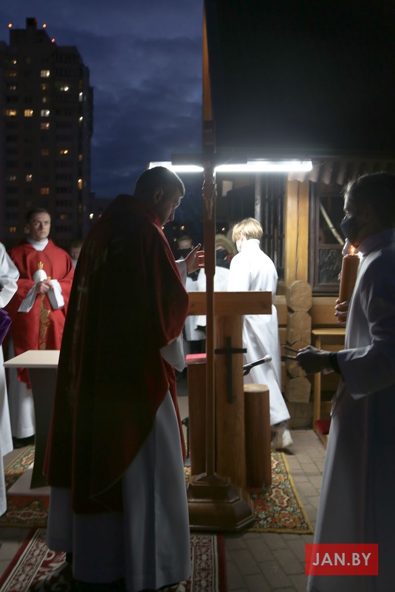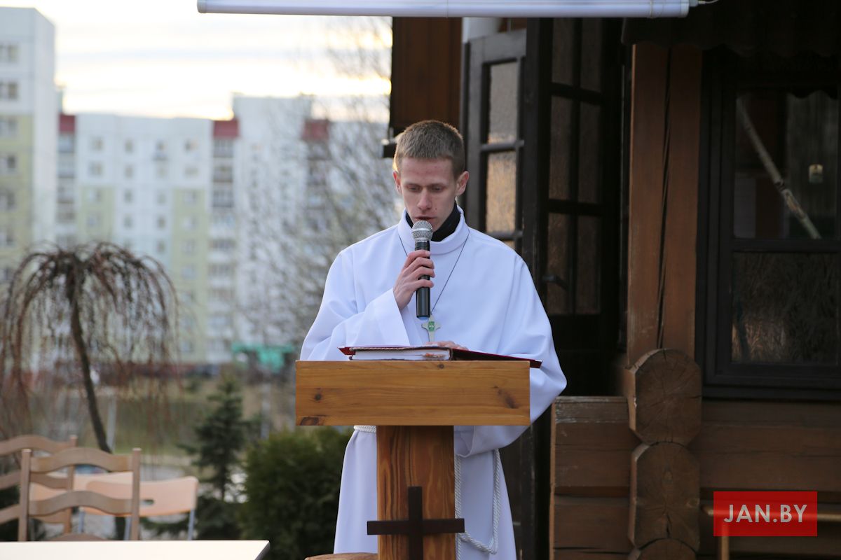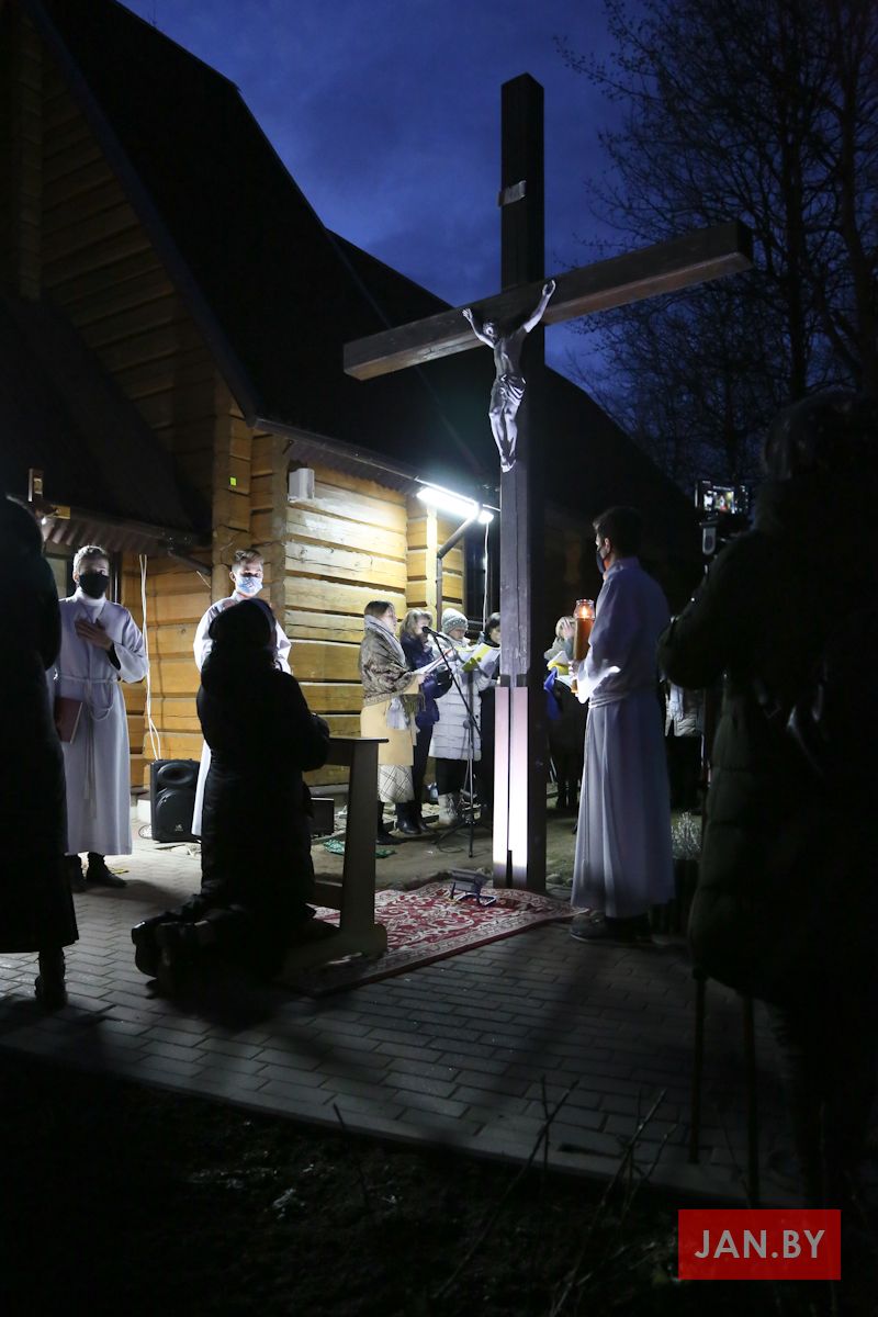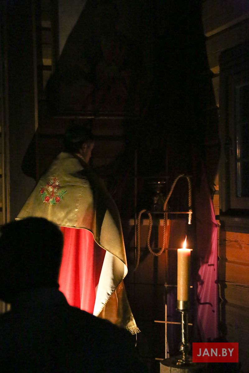 Цэлебрацыю літургіі Мукі Пана ў нашай капліцы ўначаліў пробашч парафіі кс. Алег Шпець SChr. Спачатку святар паклаўся перад алтаром крыжам і пэўны час маліўся ў маўчанні. Затым, падобна як у Пальмовую нядзелю, чыталася па ралях Евангелле з апісаннем Мукі Хрыста.
