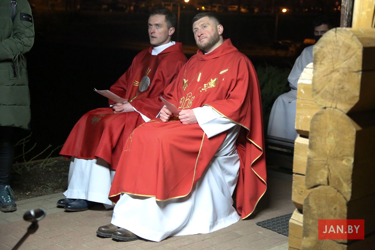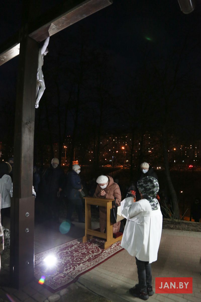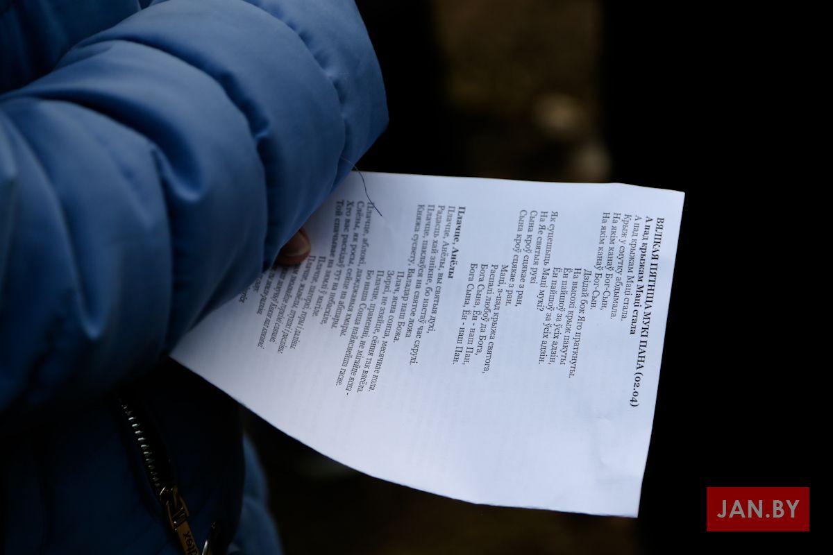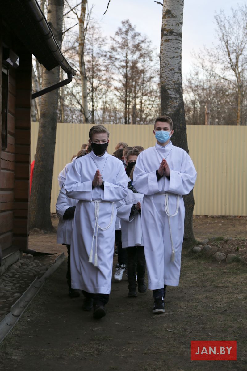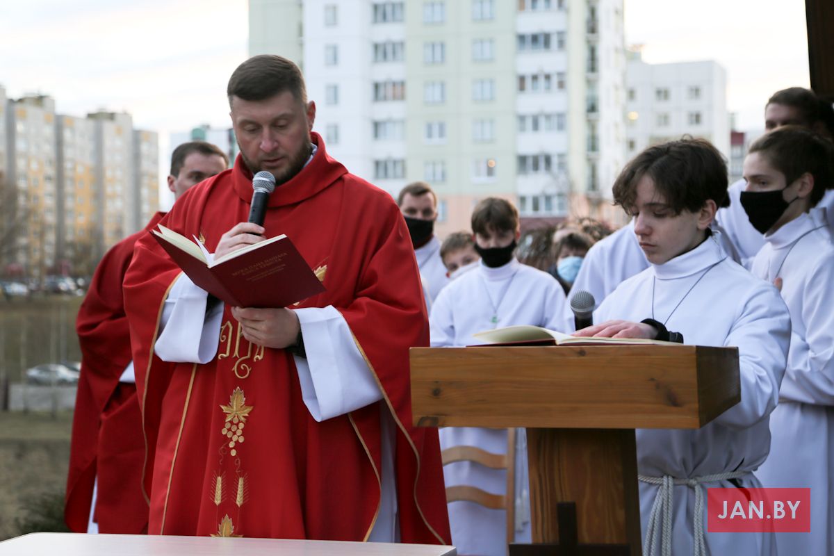 Цэлебрацыю літургіі Мукі Пана ў нашай капліцы ўначаліў пробашч парафіі кс. Алег Шпець SChr. Спачатку святар паклаўся перад алтаром крыжам і пэўны час маліўся ў маўчанні. Затым, падобна як у Пальмовую нядзелю, чыталася па ралях Евангелле з апісаннем Мукі Хрыста.