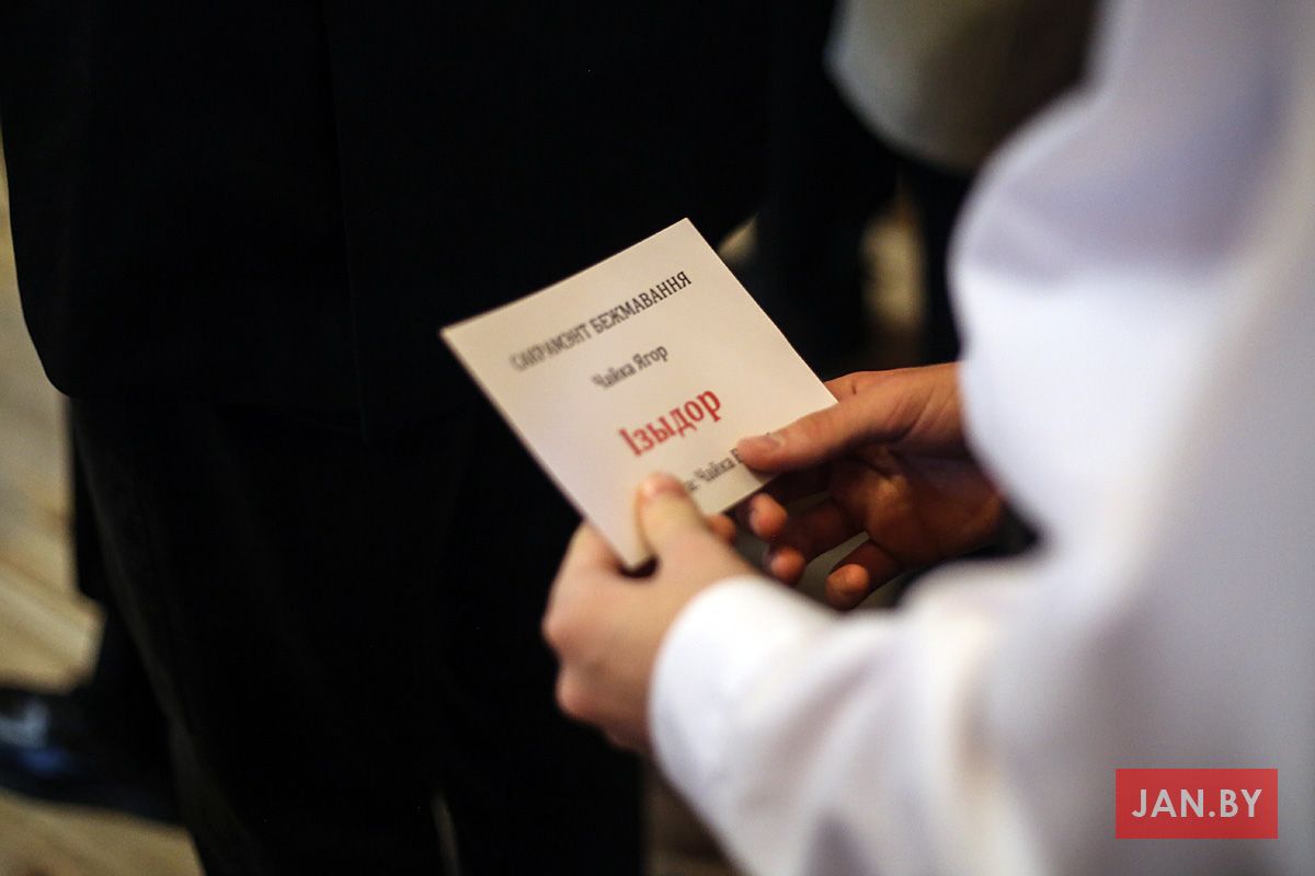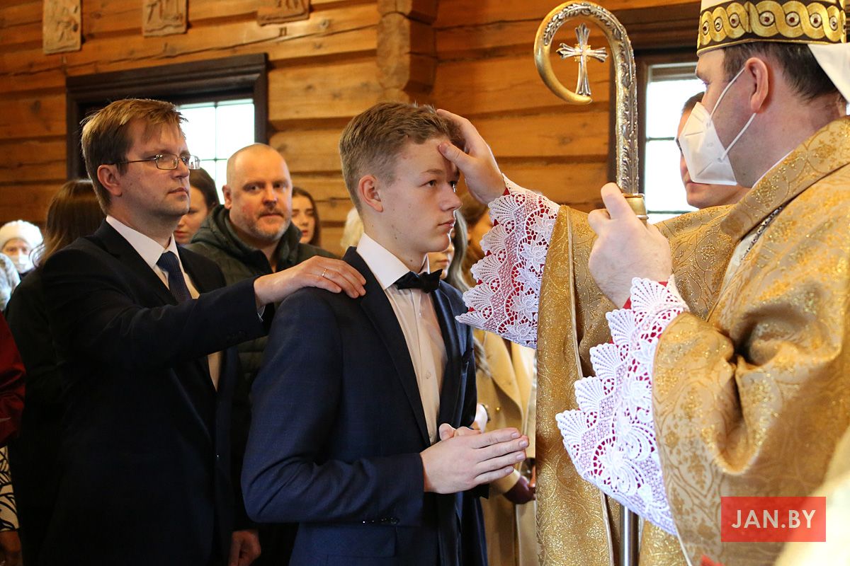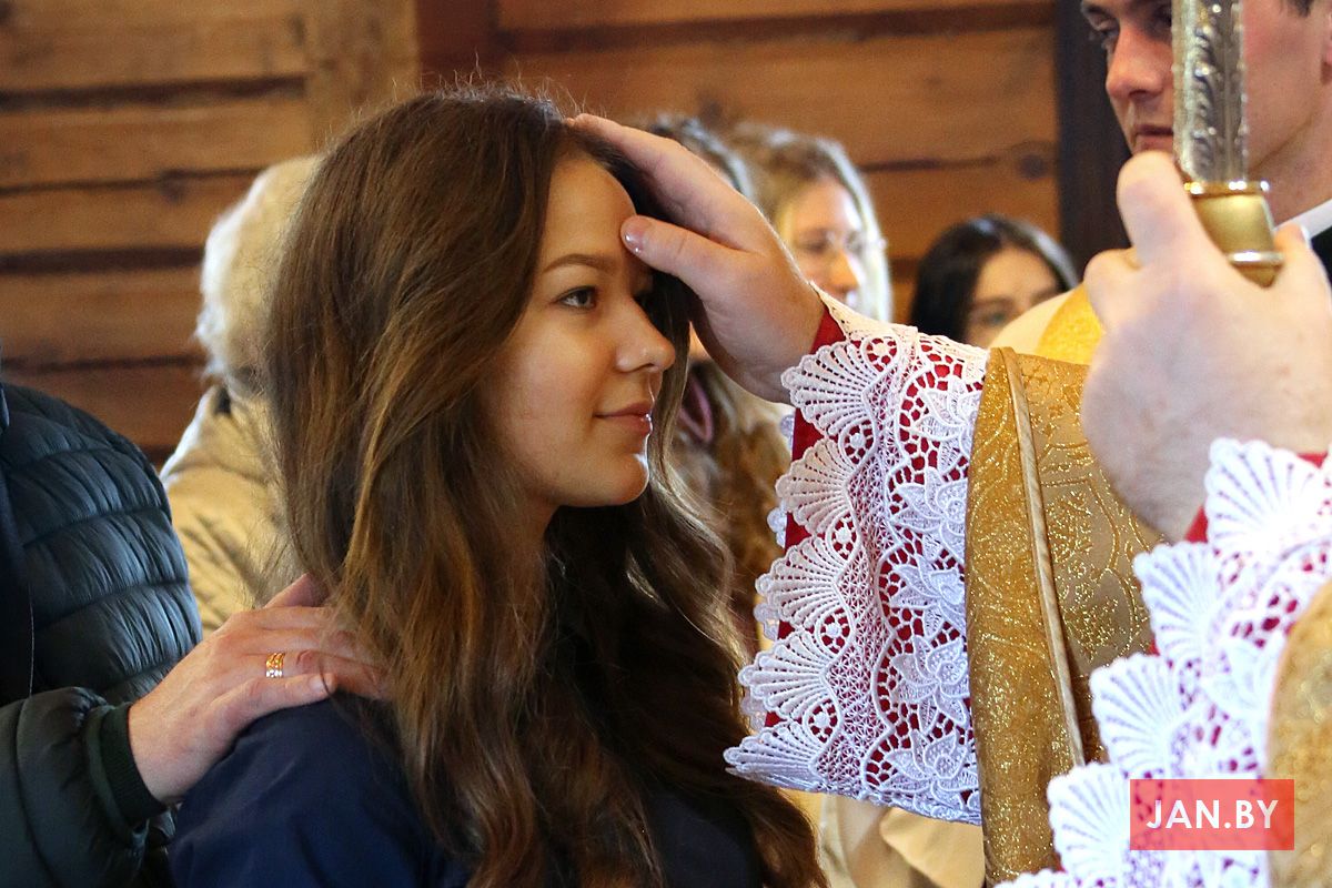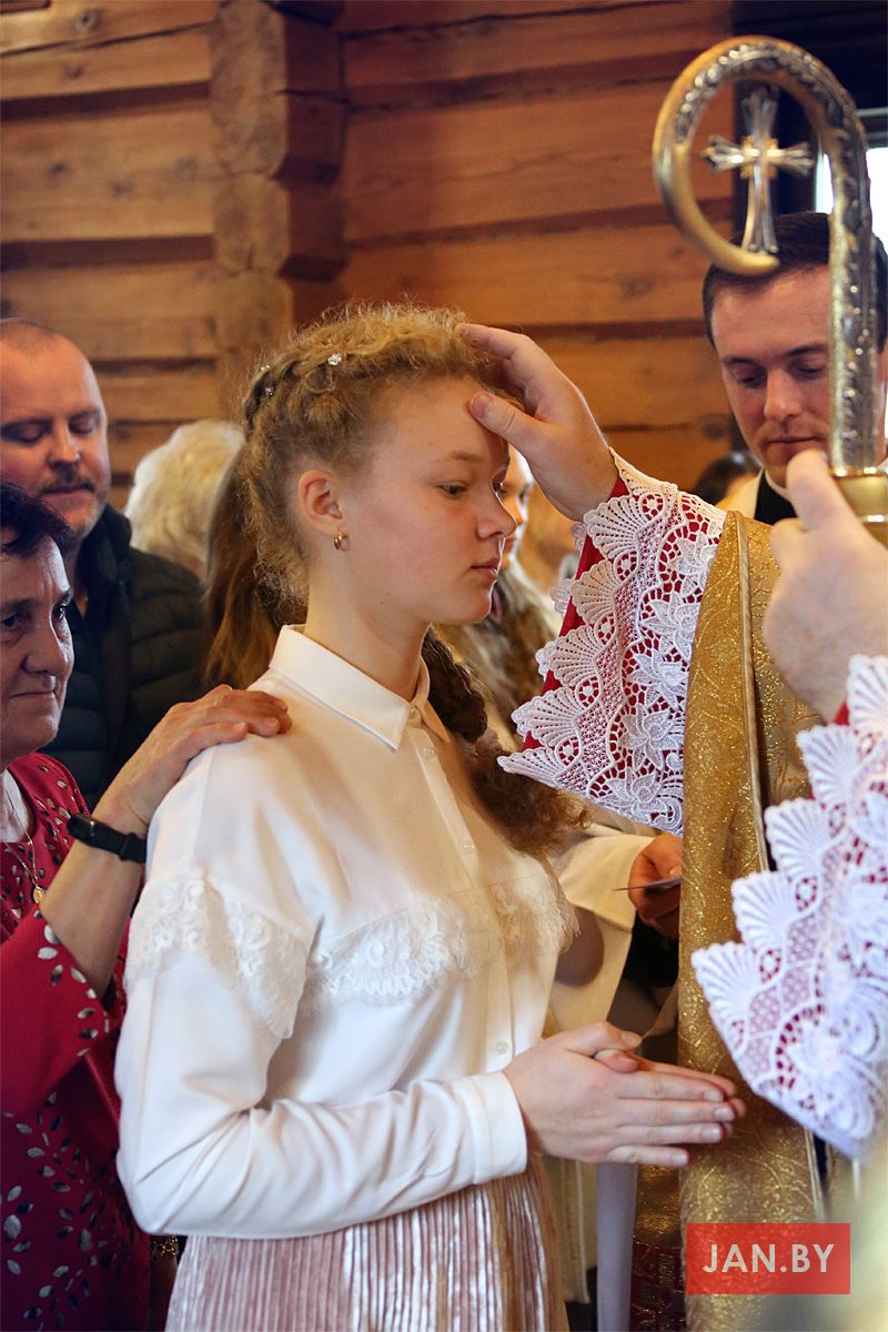 Кожны кандыдат разам са сваім сведкам падыходзіў да арцыбіскупа, які намашчаў галаву алеем са словамі: «Прымі знак дару Духа Святога!». «Амэн», — гучала ў адказ. А побач стаялі ксёндз Алег, ксёндз Уладзімір, сёстры Мар’яна і Назарыя і з радасцю назіралі за сваімі духоўнымі дзецьмі.