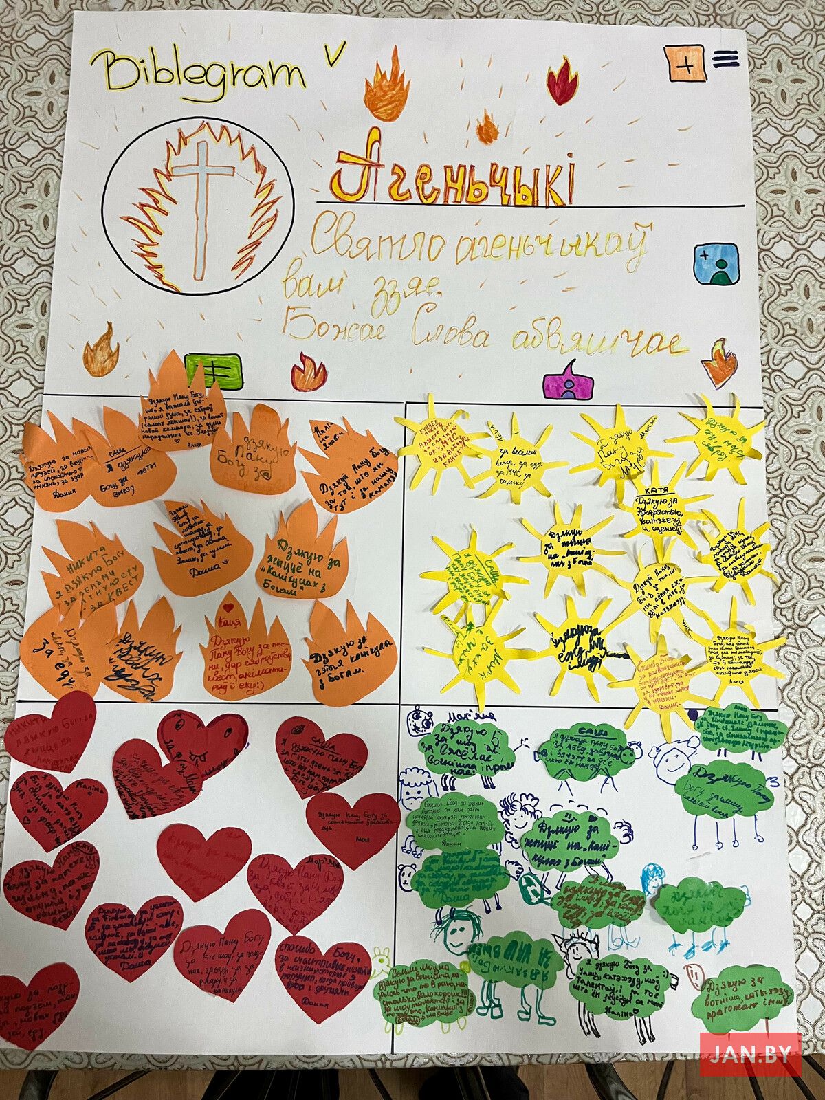 Усе мы ведаем, што Езус наказаў нам абвяшчаць Евангелле. А ў сучасным свеце адным са сродкаў для гэтага могуць стаць сацсеткі. Таму на нашых Канікулах з Богам каманды (якія таксама прыдумвалі свае назвы і дэвізы) стваралі свае ўласныя плакаты-Бібліяграмы, дзе кожны дзень яны рабілі адну публікацыю: маглі прыгадаць, што ім найбольш спадабалася за сённяшні дзень; што найбольш запомнілася; за што яны ўдзячны Богу ў гэтым дні. Кожны Бібліяграм быў вельмі прыгожы і непаўторны. А дэвізам канікулаў сталі словы «Праз Бібліяграм радасць Евангелля нясём мы вам». Напрыканцы дня кожны ўдзельнік атрымліваў на свой бэйдж наклейку з сімвалам евангеліста — знак таго, што гэты дзень яму залічаны.