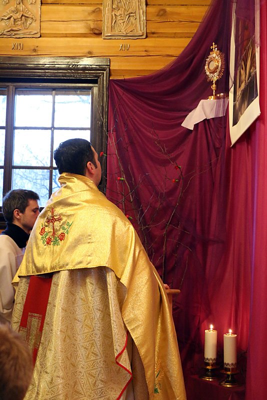 Пасля святой Iмшы Найсвяцейшы Сакрамэнт ва ўрачыстай працэсii пераносiцца да цямнiцы, дзе вернiкi адаруюць Пана Езуса, разважаючы над Яго пакутаю ў Алiўным садзе. З алтара здымаюць убранне як сiмвал таго, што з Езуса здзерлi шаты.