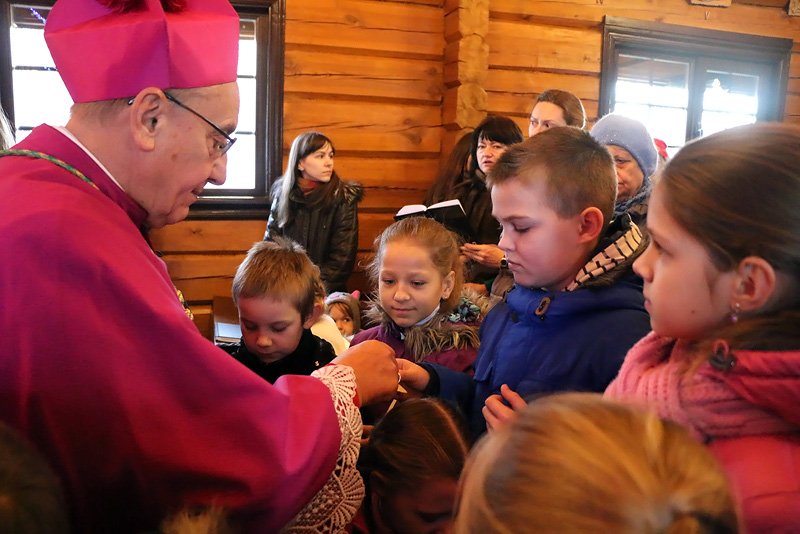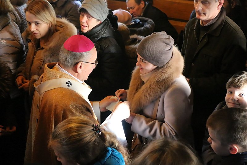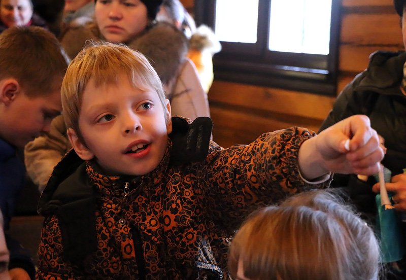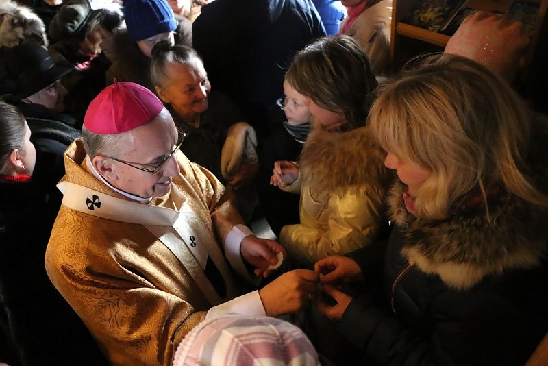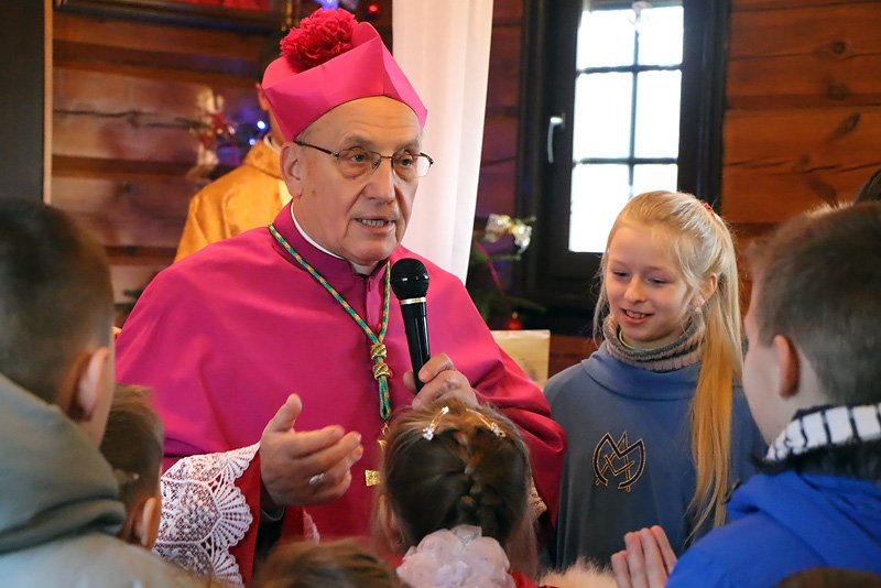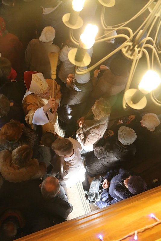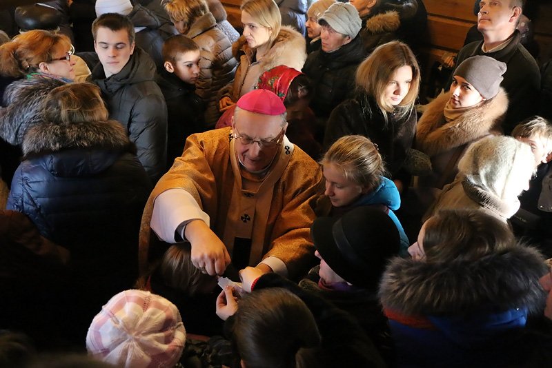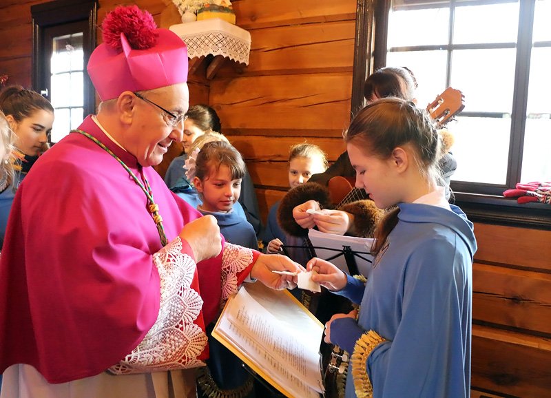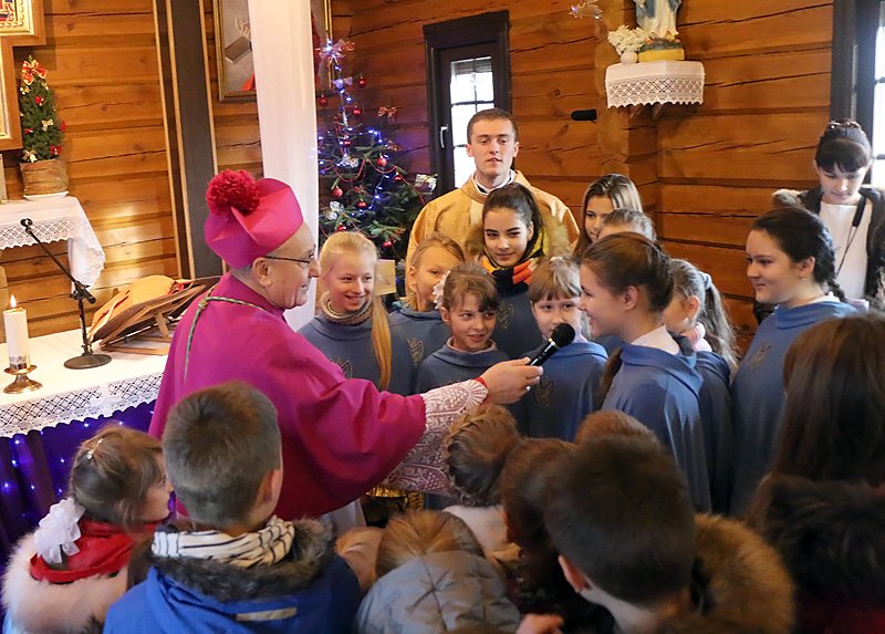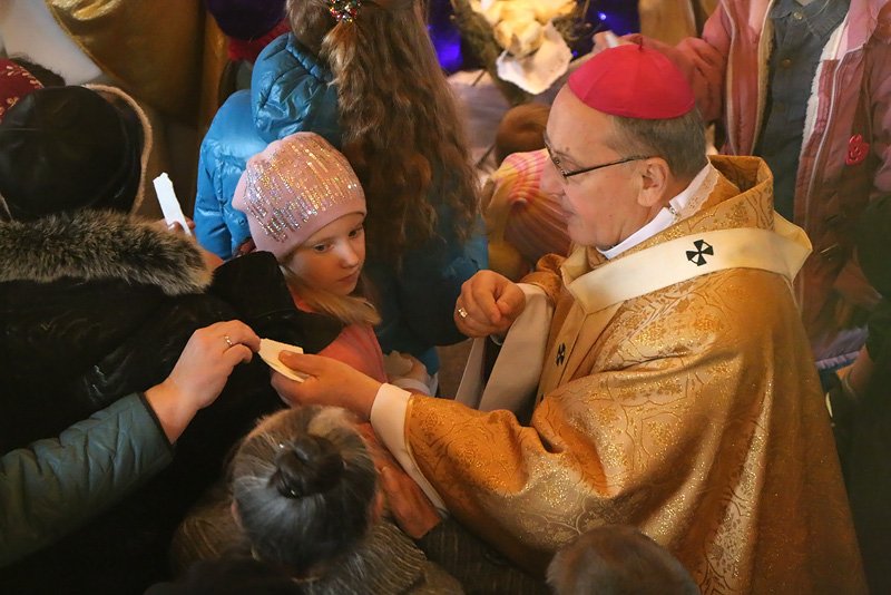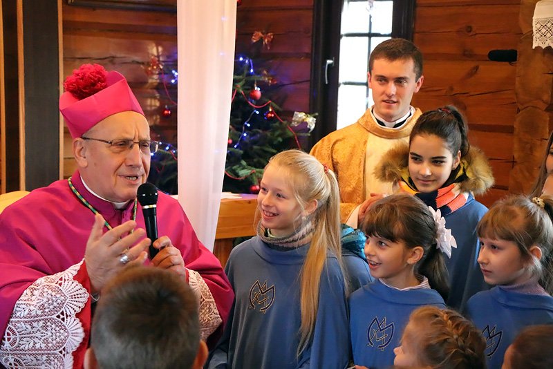 Перад святой Імшой іерарх сустрэўся з дзецьмі. Мітрапаліт павіншаваў іх з Божым Нараджэннем, пажадаў моцнай веры і падзяліўся з малымі парафіянамі аплаткай.