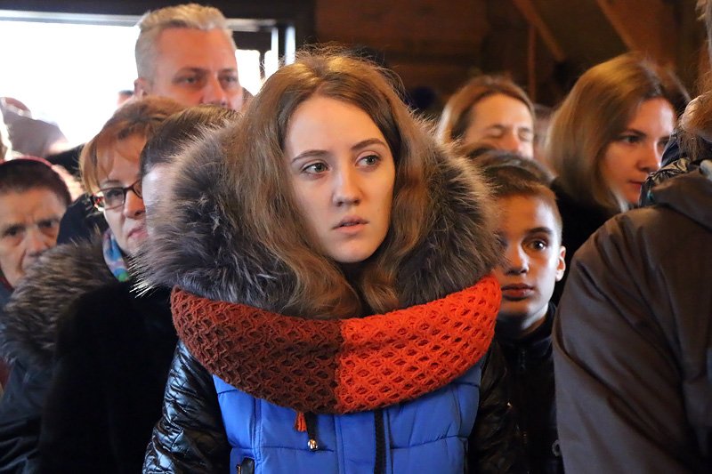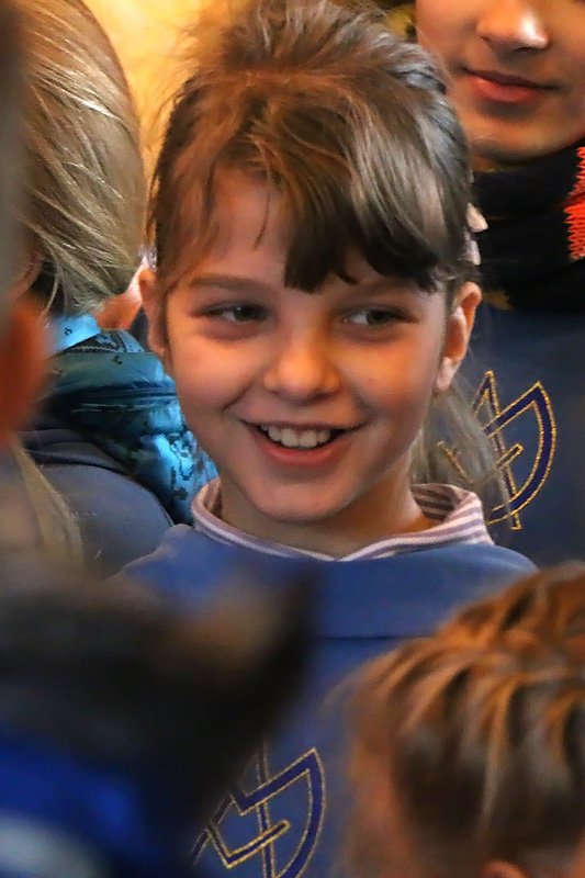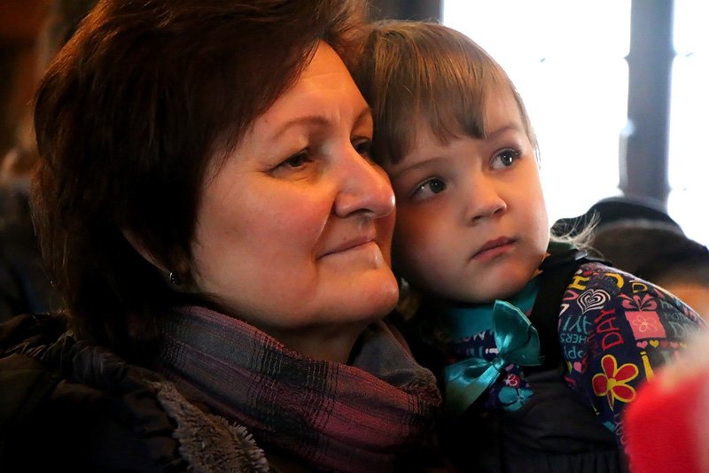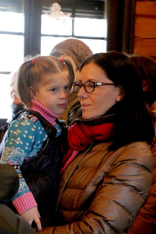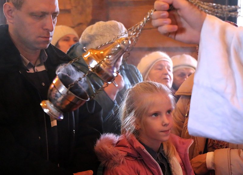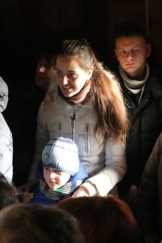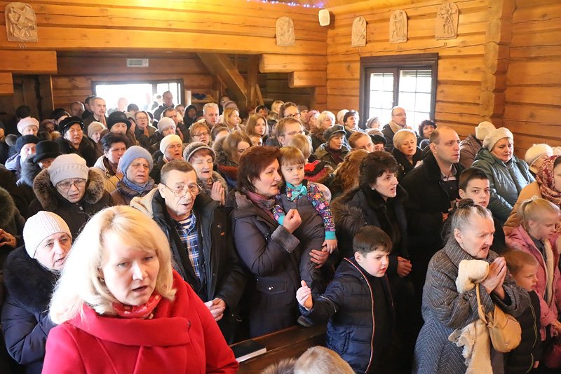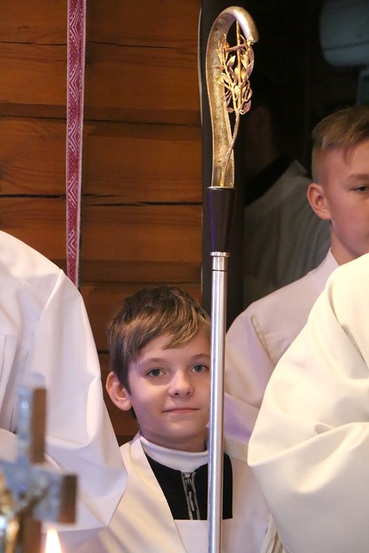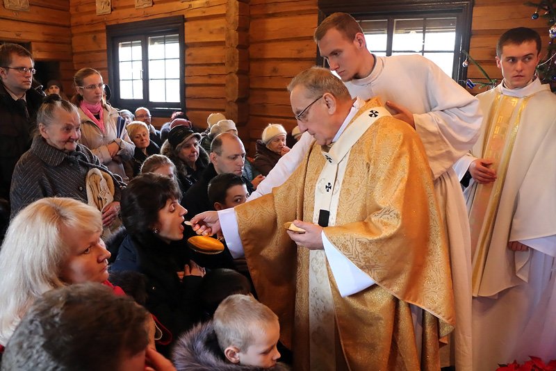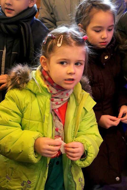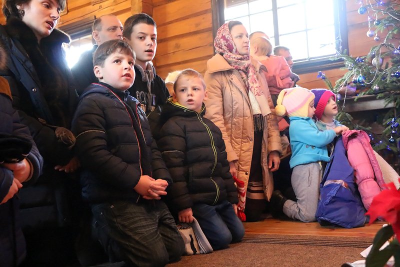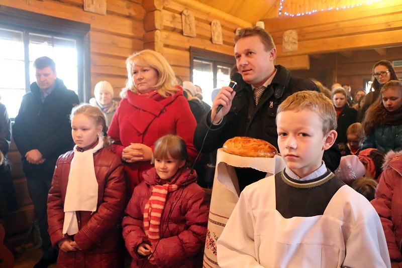 Перад святой Імшой іерарх сустрэўся з дзецьмі. Мітрапаліт павіншаваў іх з Божым Нараджэннем, пажадаў моцнай веры і падзяліўся з малымі парафіянамі аплаткай.