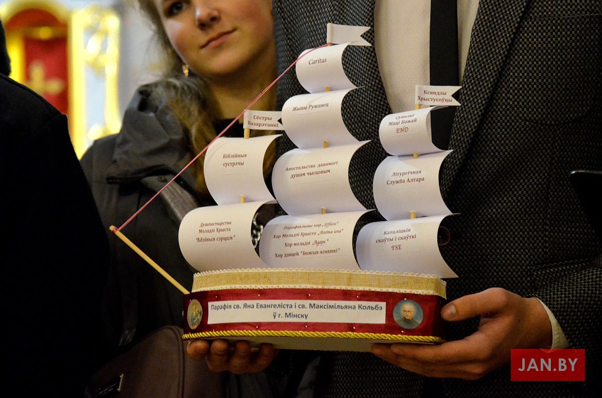 Незвычайнай часткай праграмы стала прынясенне «дароў» ад парафій. Моладзь Хрыста прадставіла карабель пад назвай “Парафія cв. Яна Евангеліста і св. Максімільяна Mарыя Кольбэ ў г. Мінску”, які ўвасабляў супольнасць супольнасцей. “Калі паглядзець на борт, то можна пабачыць сцягі з назвамі дзвюх манаскіх ордэнаў: ксяндзы хрыстусоўцы - нашыя душпастыры, і сёстры назарэтанкі, якія нясуць служэнне ў парафіі” - распавялі прадстаўнікі парафіі падчас сваёй прэзентацыі.