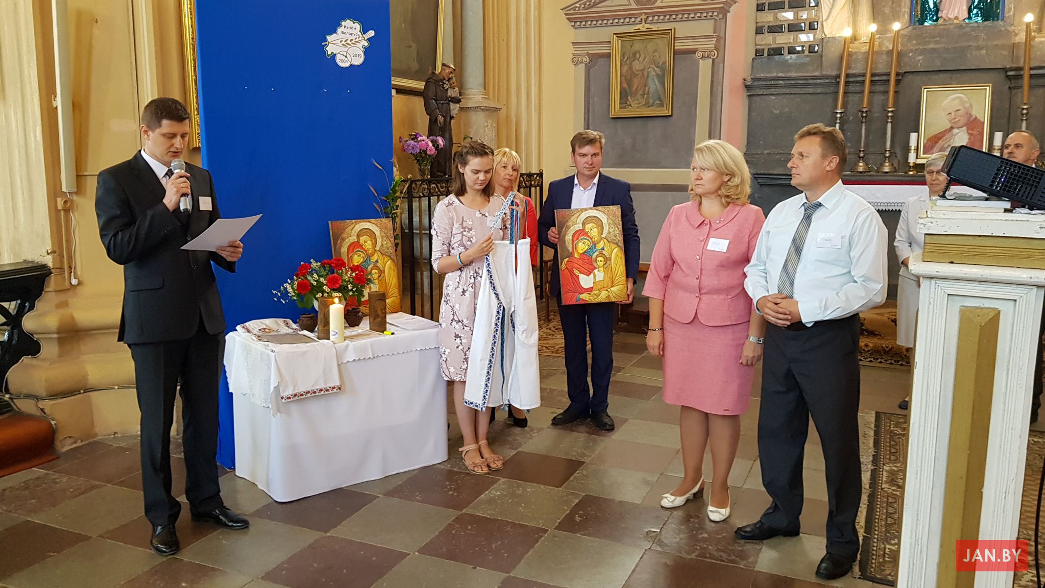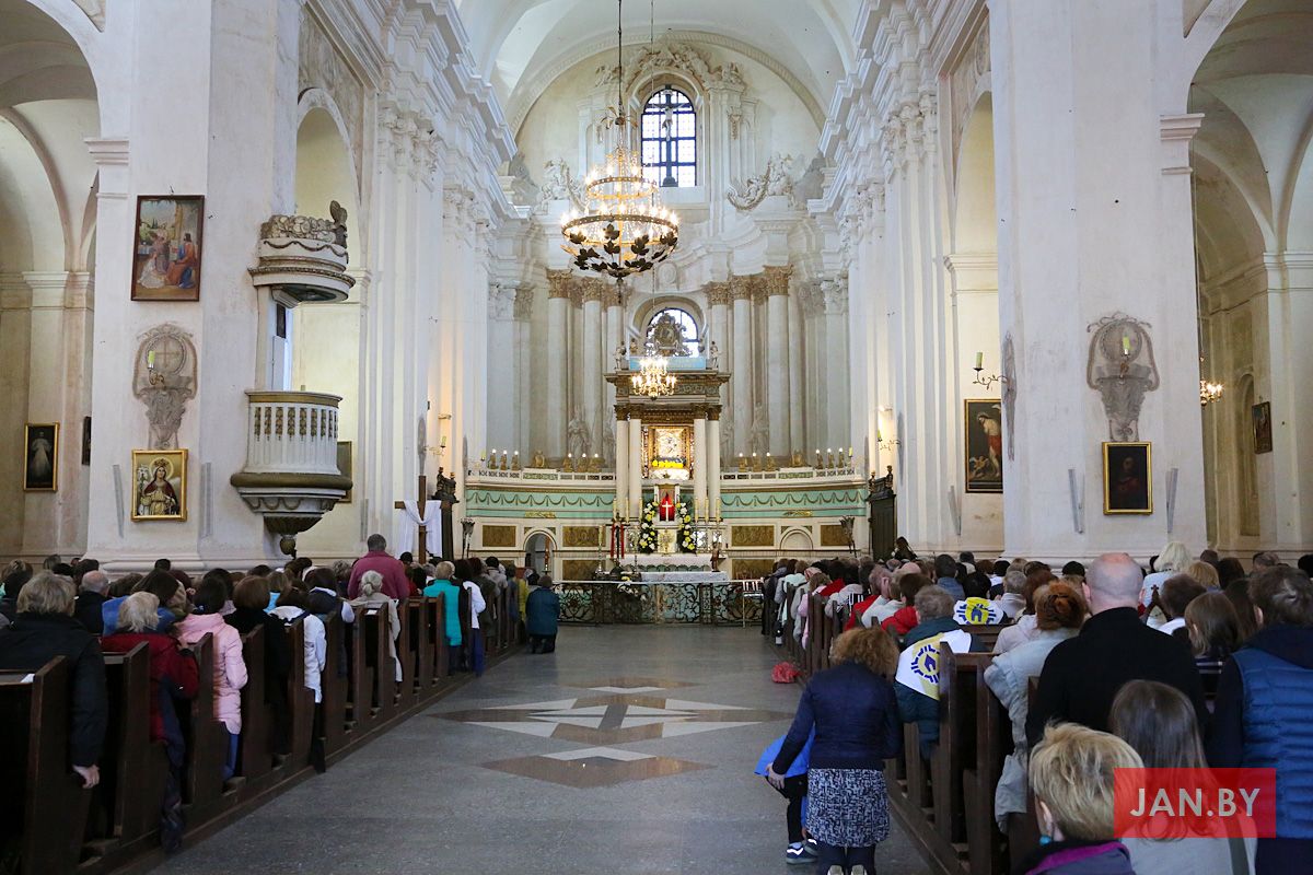 Поўная каплічка вернікаў. На дварэ кастрычнік. Нядзеля. Поўдзень. Урачыстая працэсія: крыж, Евангелле, рэліквіі. Пяць святароў ля алтара. Шмат міністрантаў. Скаўты і скаўткі з басанамі.